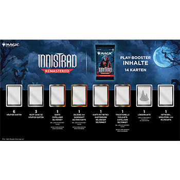 Play-Booster sind der beste Weg, alles zu erkunden, was die Gothic-Horror-Welt Innistrad zu bieten hat. Play-Booster sind für Partien im Limited-Format abgestimmt, bieten einen Riesenspaß beim Öffnen und enthalten mindestens eine Foilkarte und eine Karte mit Retro-Kartenrand.
