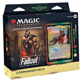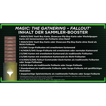 Der Vault wurde geöffnet! Dieser Booster ist so vollgestopft mit Vorteilen für Fallout-Fans, dass sie sie gar nicht alle nach Hause schleppen können. Freue dich auf seltene oder sagenhaft seltene Karten, traditionelle Foilkarten, Karten mit erweitertem Kartenrand und besondere Fallout-Kartendrucke. Jeder Magic: The Gathering – Fallout Sammler-Booster enthält 15 Magic: The Gathering Karten und 1 traditionelle doppelseitige Foil-Spielsteinkarte, darunter eine Kombination aus 7-14 Karten der Seltenheit selten oder höher und bis zu 7 nicht ganz so häufigen Karten, 5 häufigen Karten und 1 Länderkarte. Jeder Booster enthält insgesamt 12 glänzende Foilkarten, darunter 3-10 Surge-Foilkarten und 2-9 traditionelle Foilkarten.