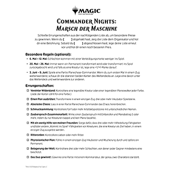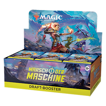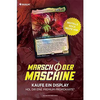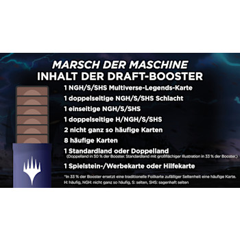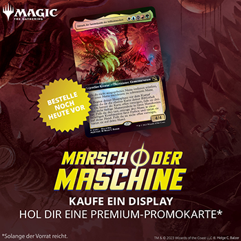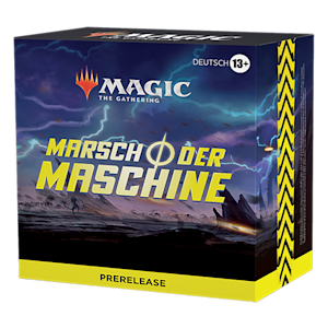 Das Marsch der Maschine Prerelease-Pack enthält 6 Marsch der Maschine Draft-Booster, 1 seltene oder sagenhaft seltene traditionelle Foilkarte mit Datumsstempel, 1 neue sagenhaft seltene Karte (in 18 % der Prerelease-Packs als traditionelle Foilkarte), 1 Code-Karte zum Freischalten von 6 Marsch der Maschine Boostern in Magic: The Gathering Arena (nur in ausgewählten Regionen verfügbar), 1 Deckbox und 1 Spindown-Lebenspunktezähler.