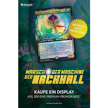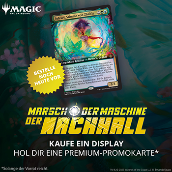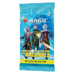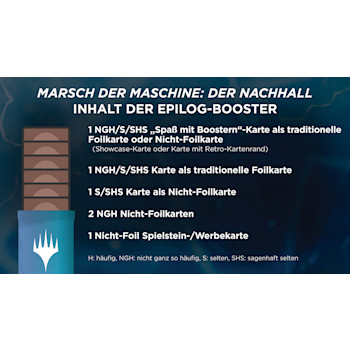 Jeder Marsch der Maschine: Der Nachhall Epilog-Booster enthält 5 Karten in einer Kombination aus 1-3 Karten der Seltenheit selten oder höher und 2-4 nicht ganz so häufigen Karten. In jedem Booster sind insgesamt 1-2 Karten beliebiger Seltenheit traditionelle Foilkarten.