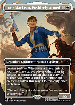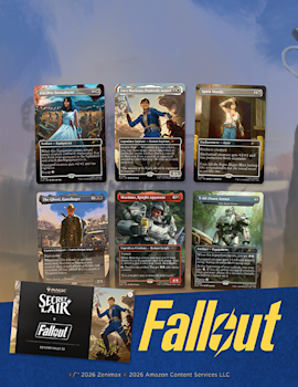 For the first time, the survivors from Prime Video’s Fallout series make their debut with new-to-Magic designs. Lucy MacLean brings her optimism to the battlefield with The Golden Rule, a once-per-turn ability that lets you trade token favors for card draw. The Ghoul feeds on death itself, stacking up Rad counters to mill or wipe out opponents—or, if you’re feeling bold, take that radiation yourself for extra resources. And Maximus, ever the true believer, turns scrap into strength, fueling up on Energy as he powers up his own T-60 Power Armor.