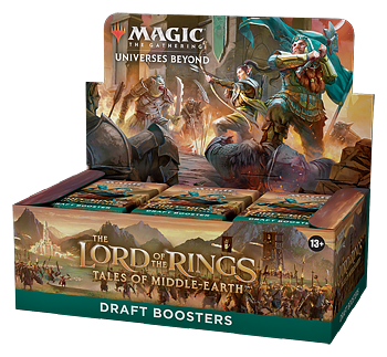 Each The Lord of the Rings: Tales of Middle-earth Draft Booster contains 15 cards and 1 token/ad card or Helper card, including 1 card of rarity Rare or higher and 3 Uncommons, 10 Commons, and 1 Land cards. Traditional Foil Borderless Mythic Rare card in <1% of boosters. Traditional Foil of any rarity replaces a Common in 33% of boosters.