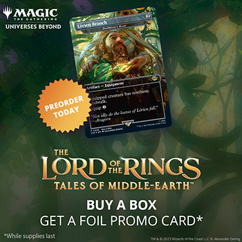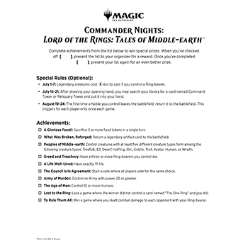 The best way to build a Sealed deck right out of the box—The Lord of the Rings: Tales of Middle-earth Prerelease Pack contains 6 The Lord of the Rings: Tales of Middle-earth Draft Boosters, 1 Traditional Foil year-stamped Rare or Mythic Rare card, 1 Traditional Foil year-stamped card from a pool of 6 Prerelease Promo cards, 1 Helper card, 1 MTG Arena code card (only available in select regions), 1 deck box, and 1 Spindown life counter.