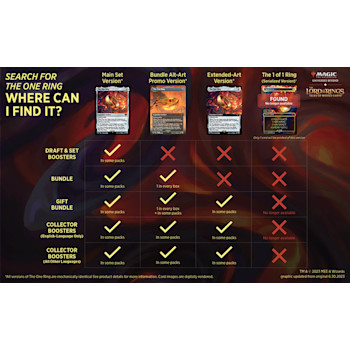 This product does not contain Serialized Ring cards including the Serialized Elven, Dwarven, or Human Sol Ring cards, and The 1 of 1 Ring (Serialized 001 of 001). Serialized Elven, Dwarven, and Human Sol Ring cards can only be found in some The Lord of the Rings: Tales of Middle-earth Collector Boosters. Only one card has been printed of The One Ring (Serialized 001 of 001), and this card can only be found in one English-Language Collector Booster. Non-serialized Ring cards are mechanically identical to their Serialized versions.