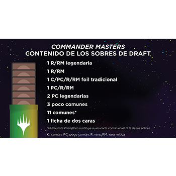 Cada sobre de Draft de Commander Masters contiene 20 cartas y 1 ficha de dos caras, e incluye entre 2 y 4 cartas raras o de una rareza superior (3: 36 %; 4: 3 %), entre 5 y 7 poco comunes y entre 11 y 12 comunes. Hay 1 carta rara mítica sin borde foil tradicional en menos del 1 % de los sobres.