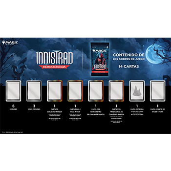 Vuelve al plano del terror gótico más glorioso y rescata fantásticas reimpresiones de todas las colecciones de Innistrad creadas hasta la fecha con Innistrad remasterizada. Deléitate con los tratamientos resaltados del pasado de Innistrad y contempla nuevas ilustraciones sin borde que resultan bu-nitas e inquietantes. ¡Además, cada sobre de juego está repleto de nostalgia con una carta con marco retro!