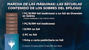 Cada sobre del epílogo de Marcha de las máquinas: las secuelas contiene 5 cartas, con una combinación de entre 1 y 3 cartas raras o de una rareza superior y entre 2 y 4 poco comunes. En todos los sobres, 1 o 2 cartas de cualquier rareza son foil tradicionales.