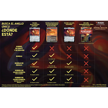 Este producto no contiene una carta de anillo seriada, incluidas las copias seriadas del Anillo solar con arte alternativo élfico, enano y humano, así como el anillo seriado como 1 de 1. Las copias seriadas del Anillo solar élfico, enano y humano solo se pueden encontrar en algunos sobres de coleccionista de El Señor de los Anillos: relatos de la Tierra Media. Solo se imprimió una copia de El Anillo Único (seriada como 001 de 001) y esta carta solo se puede encontrar en un sobre de coleccionista en inglés. Las cartas de anillo no seriadas son mecánicamente idénticas a sus contrapartes seriadas.