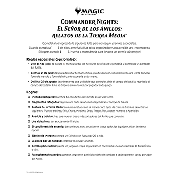 - Contenido: 6 sobres de Draft de El Señor de los Anillos: relatos de la Tierra Media, 1 carta rara o rara mítica foil de la colección principal con el año estampado, 1 carta promocional foil con el año estampado, 1 carta de ayuda, 1 tarjeta con un código para MTG Arena (solo disponible en determinadas regiones), 1 caja guardamazo y 1 contador de vidas Spindown.