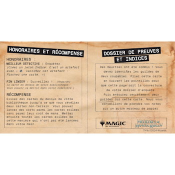 Meurtre ! Mystère ! Magic ! Une série de meurtres alarmants frappe Ravnica. Vos joueurs se mettront dans la peau des plus grands détectives du plan pour trouver des indices et résoudre l'affaire. Découvriront-ils qui se cache derrière ces meurtres avant qu'il ne soit trop tard ?