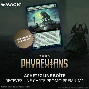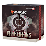 Le Pack d'avant-première Tous Phyrexians contient 6 boosters de draft Tous Phyrexians, 1 carte rare ou rare mythique estampillée Premium, 1 carte contenant un code pour MTG Arena (disponible uniquement dans certaines régions), 1 boîte de deck et 1 compteur de points de vie Spindown.