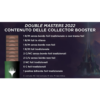 Ogni busta per draft di Double Masters 2022 contiene 16 carte di Magic e 1 carta pedina/promozionale, con una combinazione di 2-4 carte di rarità rara o superiore e 3-5 carte non comuni, 8-10 carte comuni e 1 carta terra. Due carte di qualsiasi rarità sono foil. Planeswalker mitico foil tradizionale senza bordi in <1% delle buste.