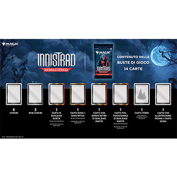 Rimetti piede nel piano caratterizzato dal suo grandioso horror gotico e riesuma le ristampe delle carte più amate dai fan provenienti da tutte le espansioni di Innistrad mai stampate con Innistrad Remastered. Sgrana gli occhi al trattamento in stile vetrina per le glorie del passato di Innistrad e brama le nuove carte senza bordi di una bellezza... spaventosa! Inoltre, ogni busta sarà gonfia di nostalgia con una carta con bordo retrò!
