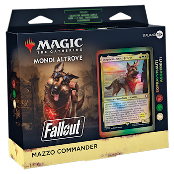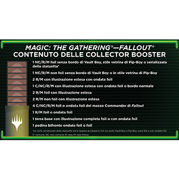 Il vault è aperto! Questa busta contiene così tante ricchezze per i fan di Fallout, che metterà a dura prova i limiti del tuo inventario. Preparati ad affrontare rare e/o mitiche, carte foil, con illustrazione estesa e carte con speciali trattamenti a tema Fallout. Ogni Collector Booster di Magic: The Gathering—Fallout contiene 15 carte di Magic: The Gathering e 1 pedina bifronte foil, con una combinazione di 7-14 carte di rarità rara o superiore e fino a 7 non comuni, fino a 5 comuni e 1 carta terra. Ogni busta contiene un totale di 12 carte con un brillante trattamento foil, incluse 3-10 carte con ondata foil e 2-9 foil.