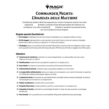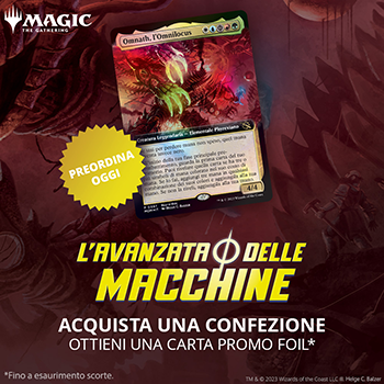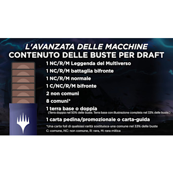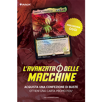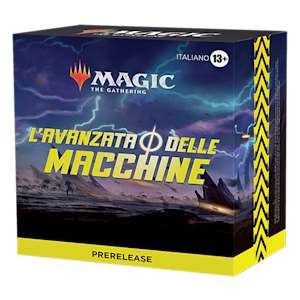 Il Prerelease Pack di L’Avanzata delle Macchine contiene 6 buste per draft di L’Avanzata delle Macchine, 1 rara o rara mitica foil, con l’anno impresso, 1 nuova carta rara mitica (foil tradizionale nel 18% dei Prerelease Pack), 1 carta con codice per sbloccare 6 buste di L’Avanzata delle Macchine in Magic: The Gathering Arena (disponibile soltanto in alcune regioni), 1 portamazzo e 1 segnapunti vita Spindown.