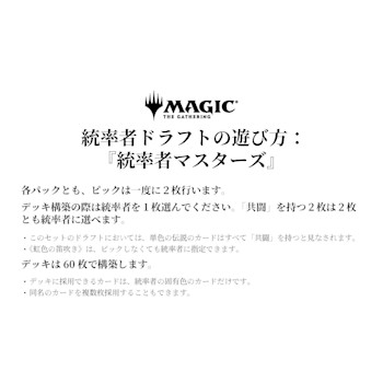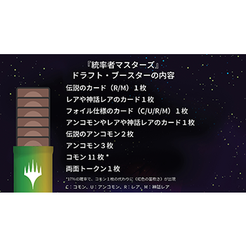 - 内容――『統率者マスターズ』ドラフト・ブースター1パック(マジックのカード20枚入り)