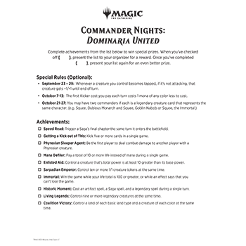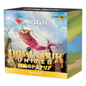 『団結のドミナリア』プレリリース・パックには、『団結のドミナリア』 ドラフト・ブースター6パックと日付が印刷されたフォイル仕様のレアや神話レア1枚、MTGアリーナのコードが書かれたカード1枚(対応地域のみ)、デッキボックス1つ、スピンダウン・ライフカウンター1つが同梱されています。