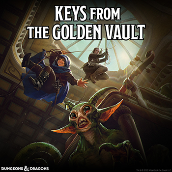 『Keys from the Golden Vault』は、1~11レベルのキャラクター用にデザインされた、それ単独で遊べる全13本のダンジョンズ&ドラゴンズアドベンチャー集。これらのアドベンチャーはいずれも既存のあらゆる背景世界に組み込み可能で、一回限りのセッションとして遊ぶことも、あるいは自分のキャンペーン・ゲームに織り込むこともできます。また本書には、強奪計画を立てるのに役立つ、ゲーム内でキャラクターが目にするとおりのプレイヤー用地図、そして高い危険と引き換えに莫大な見返りを得るという、これまでにない形のゲームを遊ぶノウハウも記されています。