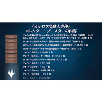 - 『カルロフ邸殺人事件』プレイ・ブースター6パック。各プレイ・ブースターには、マジックのカードが14枚封入されています。