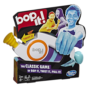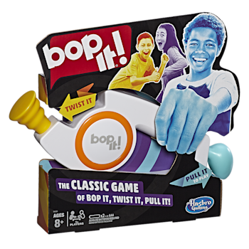 For years, players have loved the simple and exciting "Bop It, Twist It, Pull It" actions featured in this iconic Bop It! family game for kids and adults. Players can face off against friends in a multiplayer game with the pass-and-play feature or challenge themselves in solo mode. The game unit has 3 different volume settingsannounces the high score at the start of each solo game. It's an entertaining game for parties, and it makes a fun kids' travel game for car rides or vacations. Children's games also make wonderful go-to gifts for kids.