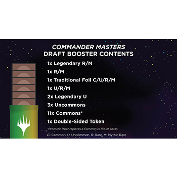 Each Commander Masters Draft Booster contains 20 cards and 1 double-sided token, including 2–4 cards of rarity Rare or higher (3: 36%; 4: 3%), 5–7 Uncommon, and 11–12 Common cards. Traditional Foil Borderless Mythic in <1% of boosters.