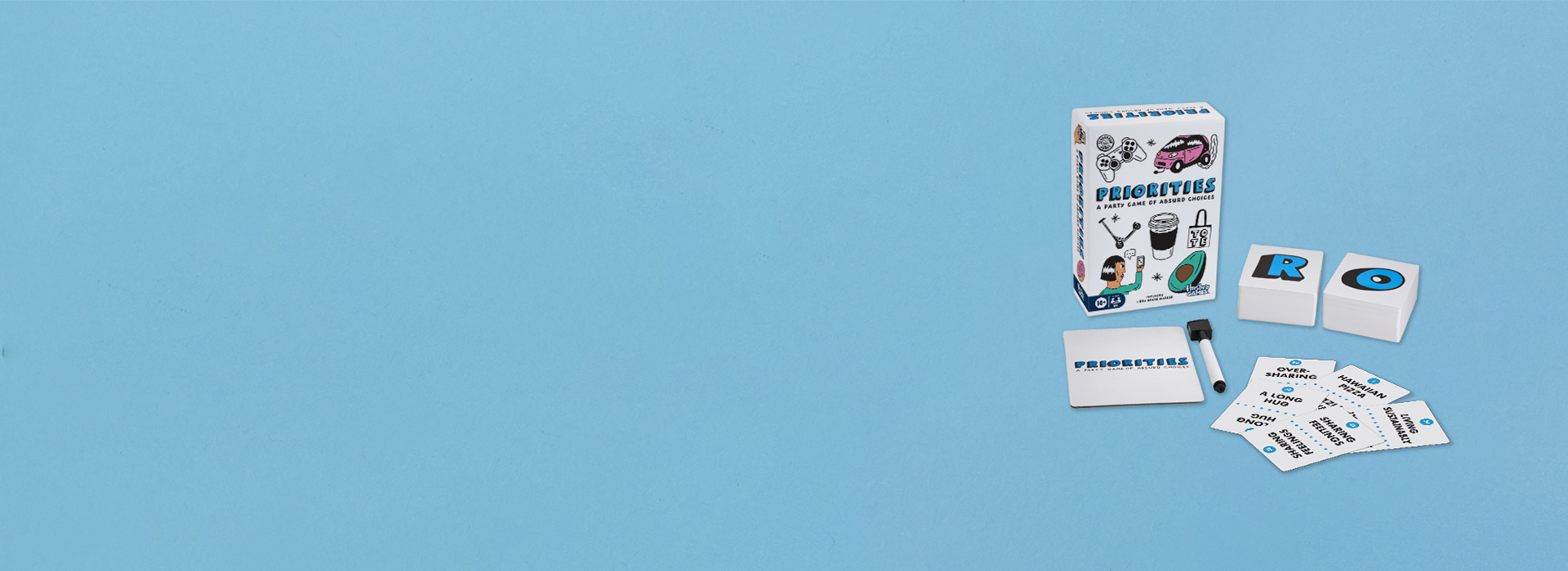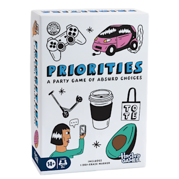 The Priorities game is the party game of absurd choices. To play, draw 5 everyday item cards and rank them from love to loathe. The other players work as a group to try to guess your order. Then compare your answers. It’s everyone versus the game! You all earn a card for every item in the same rank, and the game earns the rest. To win, spell PRIORITIES using the letters on the backs of your earned cards before the game does. For 2 or more players, this unpredictable, fun party game for adults and teens takes only 2 minutes to learn and about 30 minutes to play. So, if you’re looking to add hilarity to Family Game Night and gatherings with friends, rank the Priorities game at the top of your list! Its compact size makes it a great portable game for vacations, camping, and nights out. Game night games for groups are cool gifts for teens ages 14+ and adults too. Hasbro and all related trademarks and logos are trademarks of Hasbro, Inc.