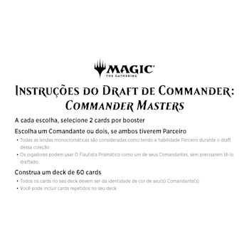 - Primeira coleção Masters para Commander — os Boosters de Masters estão repletos das melhores reimpressões de Magic: The Gathering. Commander Masters traz os primeiros Boosters de Masters desenvolvidos especificamente para Commander, o formato mais popular de Magic