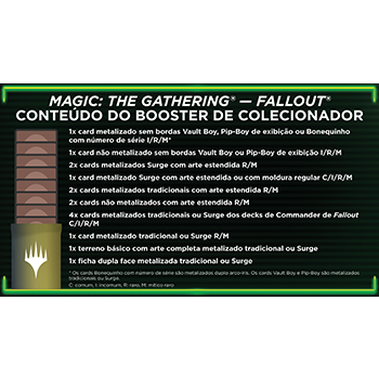 O refúgio está aberto! Este booster possui tantos benefícios para os fãs de Fallout que testará o limite da sua capacidade de carga. Espere encontrar cards raros e/ou míticos raros, metalizados tradicionais, com arte estendida e com tratamentos temáticos especiais da série Fallout. Cada Booster de Colecionador de Magic: The Gathering — Fallout contém 15 cards de Magic: The Gathering e 1 ficha dupla face metalizada tradicional, com uma combinação de 7 a 14 cards raros ou de raridade superior e até 7 incomuns, até 5 comuns e 1 card de terreno. Cada booster contém um total de 12 cards com tratamento metalizado brilhante, incluindo de 3 a 10 metalizados Surge e de 2 a 9 metalizados tradicionais.