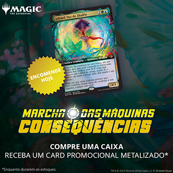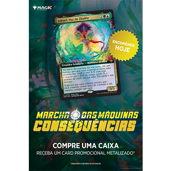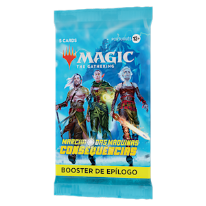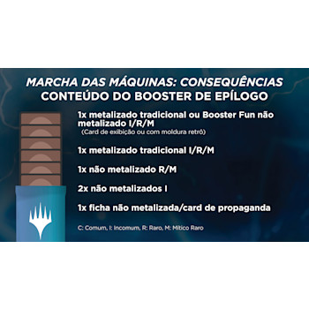 Cada booster cheio de histórias garante um card metalizado e um de exibição!Cada Booster de Epílogo de Marcha das Máquinas: Consequências contém 5 cards, com uma combinação de 1–3 cards de raridade rara ou superior e 2–4 cards incomuns. Em cada booster, um total de 1–2 cards de qualquer raridade são metalizados tradicionais.
