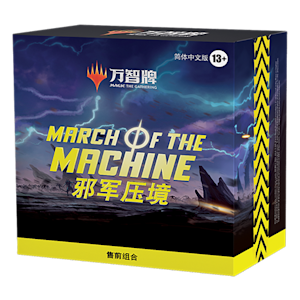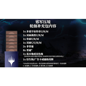 邪军压境售前组合内含6包邪军压境轮抽补充包、1张带有年份戳记的传统闪稀有或秘稀牌、1张新的秘稀牌(18%的售前组合里是传统闪)、1张可在《万智牌:竞技场》解锁6包邪军压境补充包的代码卡(仅部分地区可用),1个牌盒和1个Spindown生命计数器。