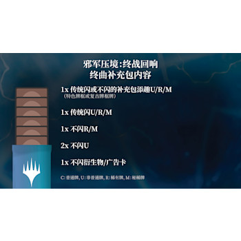 每包邪军压境:终战回响后记补充包内含5张牌,其中有1-3张稀有度为稀有或更高的牌,以及2-4张非普通牌。每包共有1-2张任意稀有度的牌是传统闪。