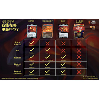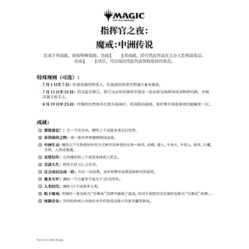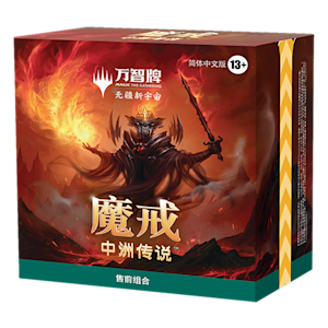 - 产品内容——6包魔戒:中洲传说轮抽补充包、1张带有年份戳记的主系列闪稀有或秘稀牌、1张带有年份戳记的闪赠卡、1张辅助用牌、1张《万智牌:竞技场》代码卡(仅部分地区可用)、1个牌盒和1个Spindown生命计数器