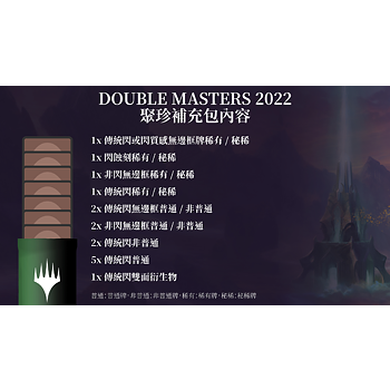 每包Double Masters 2022輪抽補充包內含16張魔法風雲會牌張,以及1張衍生物或廣告牌,牌張組合為2–4張稀有或更高稀有度的牌張、3–5張非普通牌、8–10張普通牌,以及1張地牌。兩張稀有度不限的傳統閃卡。少於1%的補充包內含秘稀無邊框鵬洛客傳統閃卡。